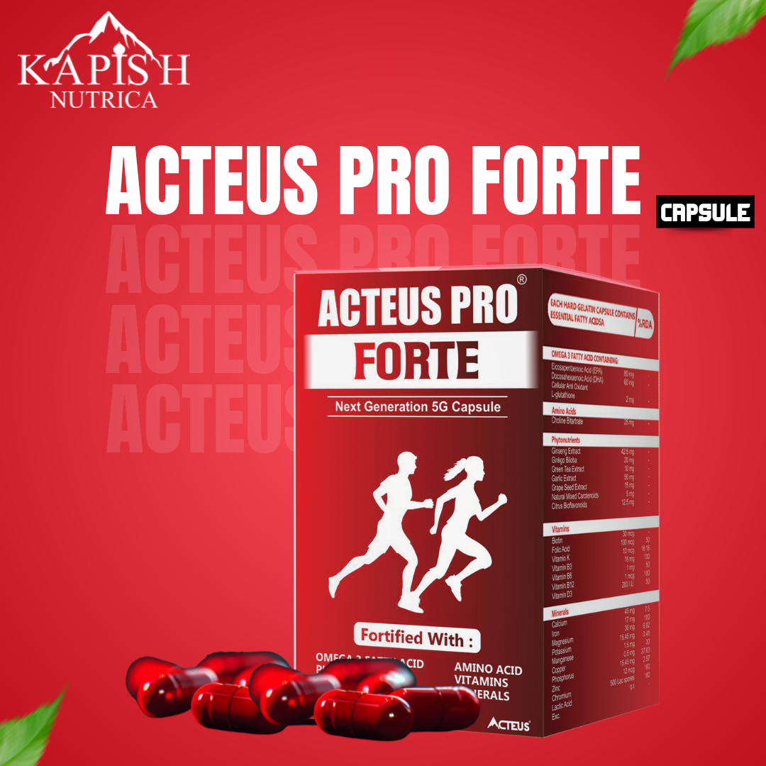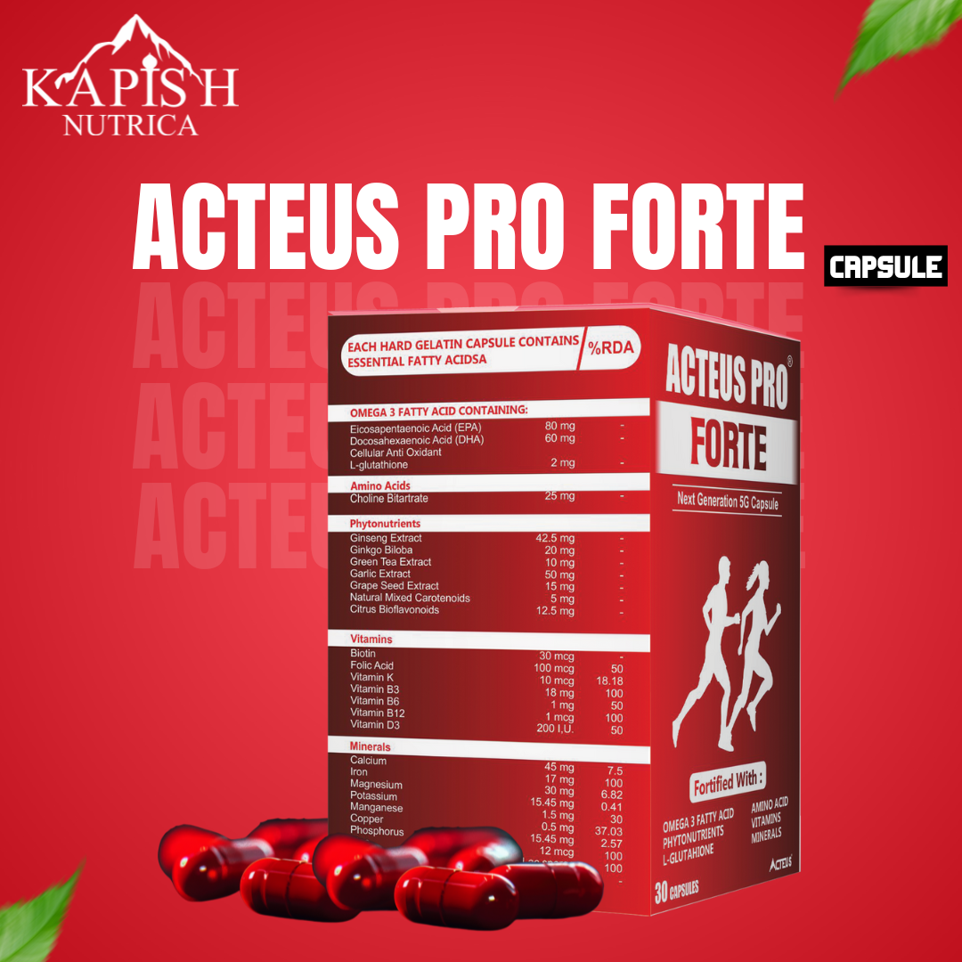 ACTEUS PRO FORTE is a premium multinutrient health supplement fortified with Omega-3 fatty acids, amino acids, phytonutrients, essential vitamins, minerals, and L-glutathione. This next-generation formulation is designed to provide complete daily wellness support by boosting energy, immunity, brain function, and overall vitality.