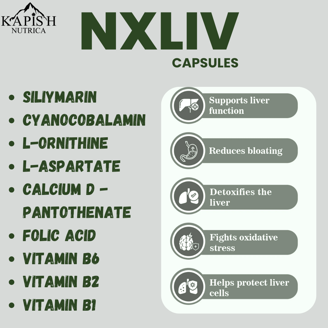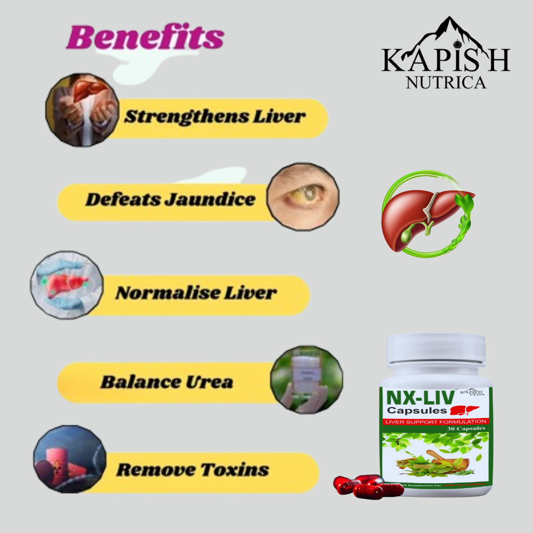 • NX-LIV is a powerful Ayurvedic liver support formulation enriched with a blend of 20+ time-tested herbs like Bhui Amla, Kasni, Punarnava, Kutki, Giloy, and Aloe. This unique combination helps in maintaining liver health, supports digestion, and promotes overall well-being. It is formulated to protect the liver from damage, enhance metabolism, and restore its normal functions naturally.