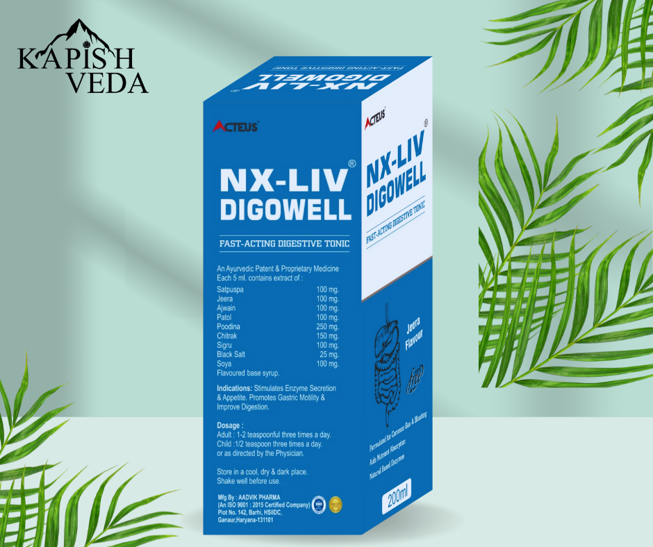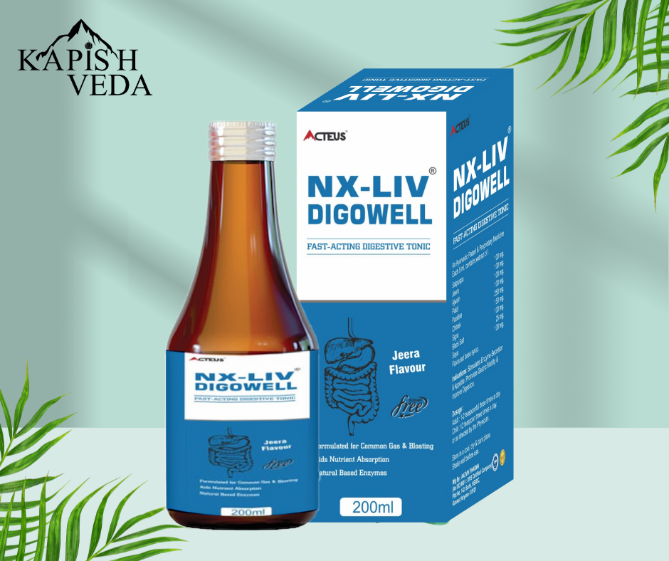 NX-LIV DIGOWELL is an Ayurvedic, fast-acting digestive tonic enriched with natural herbs and enzymes that support healthy digestion. Specially formulated with Jeera, Ajwain, Podina, Chitrak, and Haritaki, it helps relieve common digestive issues such as gas, bloating, indigestion, and poor appetite. Its jeera flavour makes it pleasant to consume, while the herbal blend promotes better enzyme secretion, gastric motility, and nutrient absorption.
