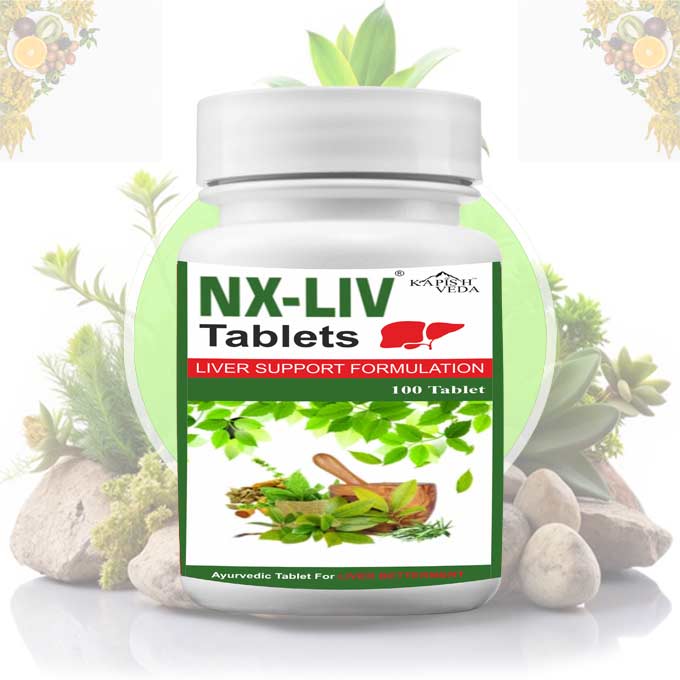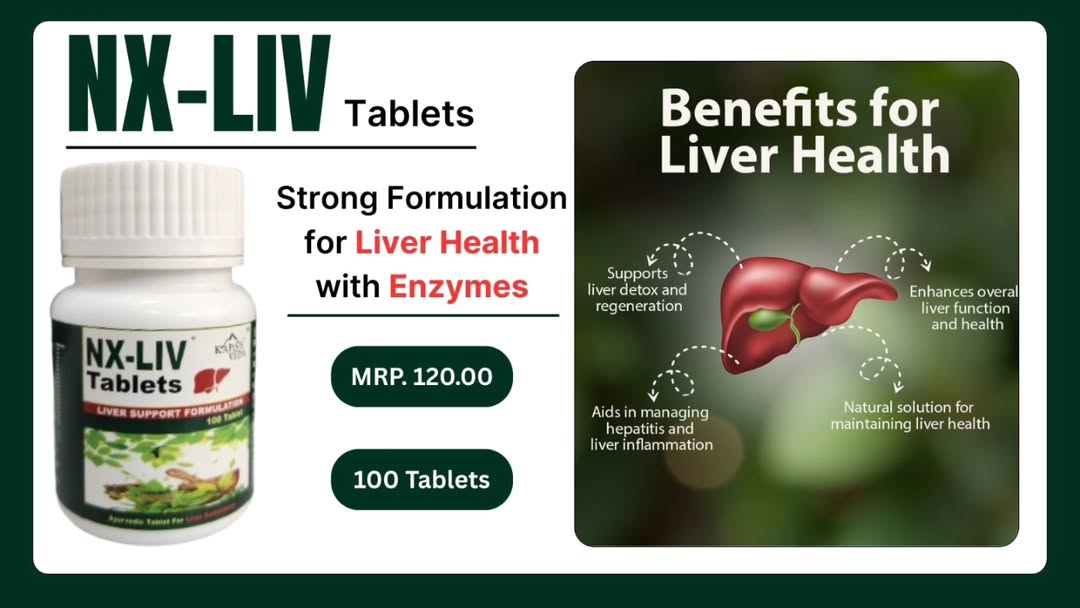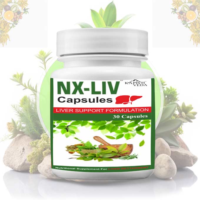 • NX-LIV is a powerful Ayurvedic liver support formulation enriched with a blend of 20+ time-tested herbs like Bhui Amla, Kasni, Punarnava, Kutki, Giloy, and Aloe. This unique combination helps in maintaining liver health, supports digestion, and promotes overall well-being. It is formulated to protect the liver from damage, enhance metabolism, and restore its normal functions naturally.