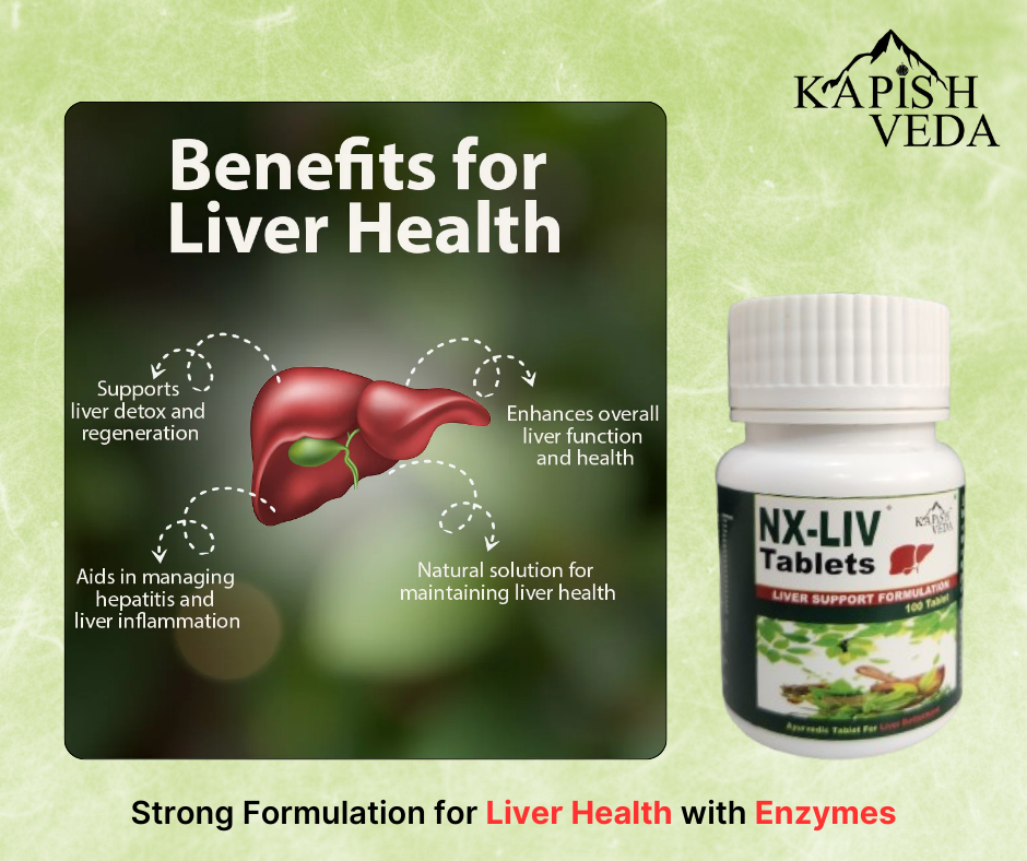 - NX-LIV is a powerful Ayurvedic liver support formulation enriched with a blend of 20+ time-tested herbs like Bhui Amla, Kasni, Punarnava, Kutki, Giloy, and Aloe. This unique combination helps in maintaining liver health, supports digestion, and promotes overall well-being. It is formulated to protect the liver from damage, enhance metabolism, and restore its normal functions naturally.